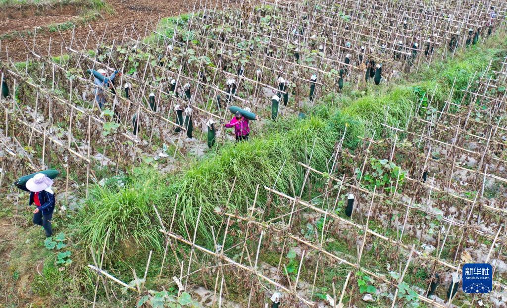 10月8日,農民在玉屏侗族自治縣田坪鎮長(cháng)嶺村采收冬瓜(無(wú)人機照片)。