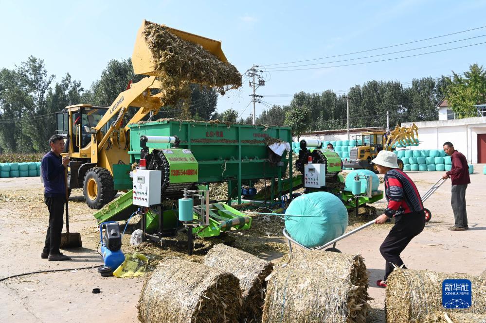 10月8日,在河南省沁陽(yáng)市柏香鎮南王村,一家種植專(zhuān)業(yè)合作社社員打包加工青貯飼料。