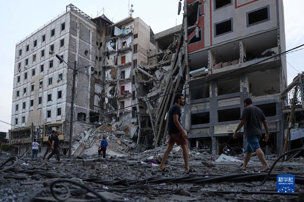 10月8日,巴勒斯坦人在加沙城查看以色列空襲后的建筑廢墟。