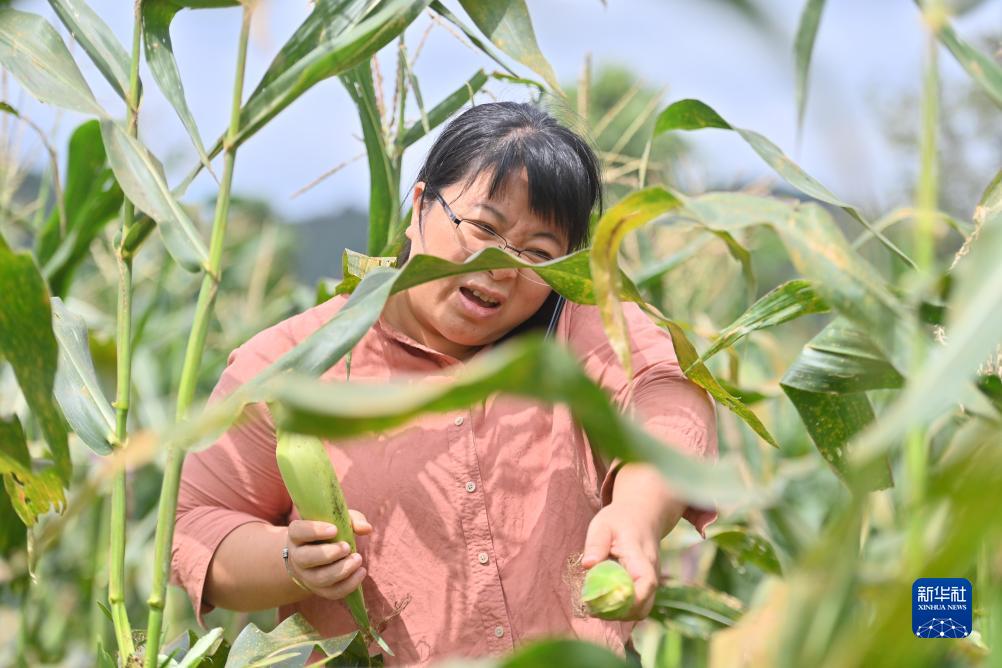 楊寧在田間一邊收玉米,一邊接聽(tīng)工作電話(huà)(10月8日攝)。新華社記者 黃孝邦 攝