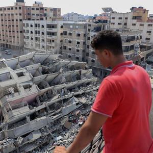 10月8日,巴勒斯坦人在加沙城查看以色列空襲后的街道。