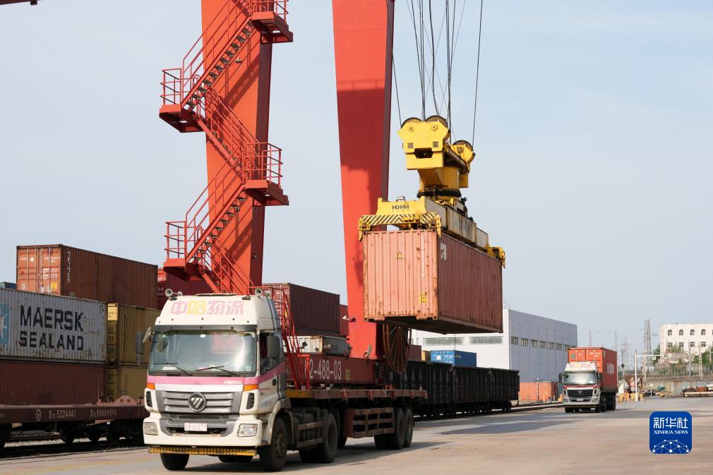 5月9日,在位于江蘇連云港的中哈連云港物流合作基地,大型機械在裝載貨物。