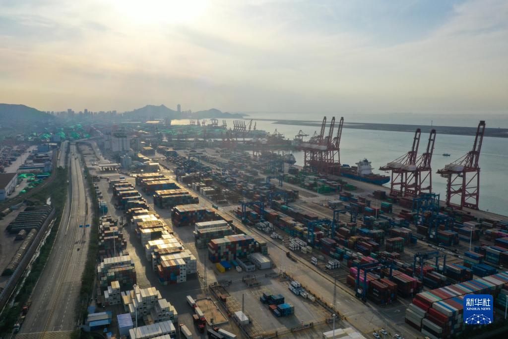 這是5月9日拍攝的連云港港集裝箱碼頭(無(wú)人機照片)。
