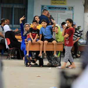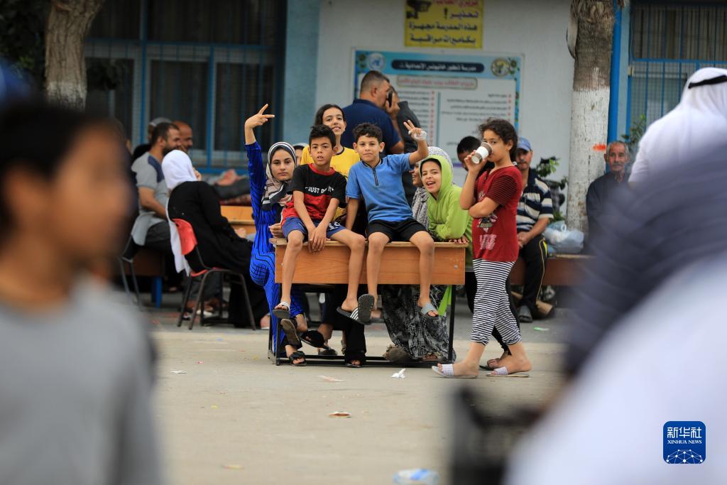 10月9日,巴勒斯坦人在加沙地帶南部城市汗尤尼斯的一所學(xué)校躲避以色列空襲。