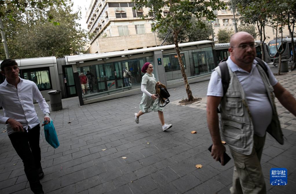 10月9日,在耶路撒冷街頭,人們在防空警報響起時(shí)沖向避難設施。