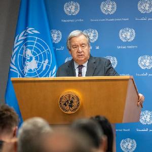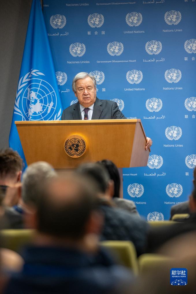10月9日,在位于紐約的聯(lián)合國總部,聯(lián)合國秘書(shū)長(cháng)古特雷斯在記者會(huì )上就巴以局勢發(fā)表談話(huà)。