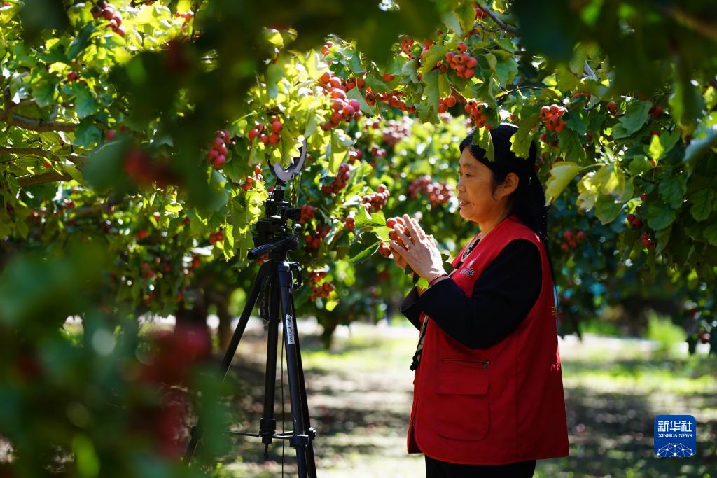 10月9日,河北省清河縣馬屯紅果種植專(zhuān)業(yè)合作社社員在山楂林里利用直播的方式推介山楂。