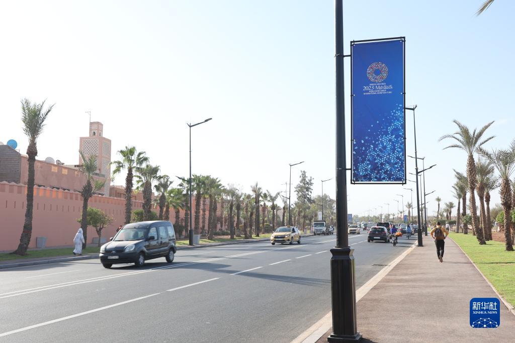 這是10月9日在摩洛哥馬拉喀什舉行的國際貨幣基金組織(IMF)和世界銀行2023年年會(huì )現場(chǎng)附近拍攝的年會(huì )宣傳海報。