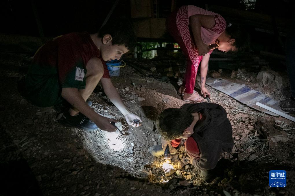10月9日,在耶路撒冷以西的阿布高什村,幾名兒童在火箭彈彈坑旁查看。