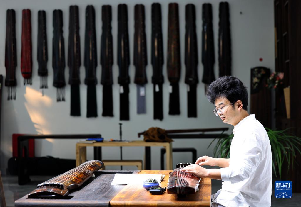 10月9日,河南省蘭考縣堌陽(yáng)鎮善斫琴社的斫琴師徐冰在彈奏古琴。