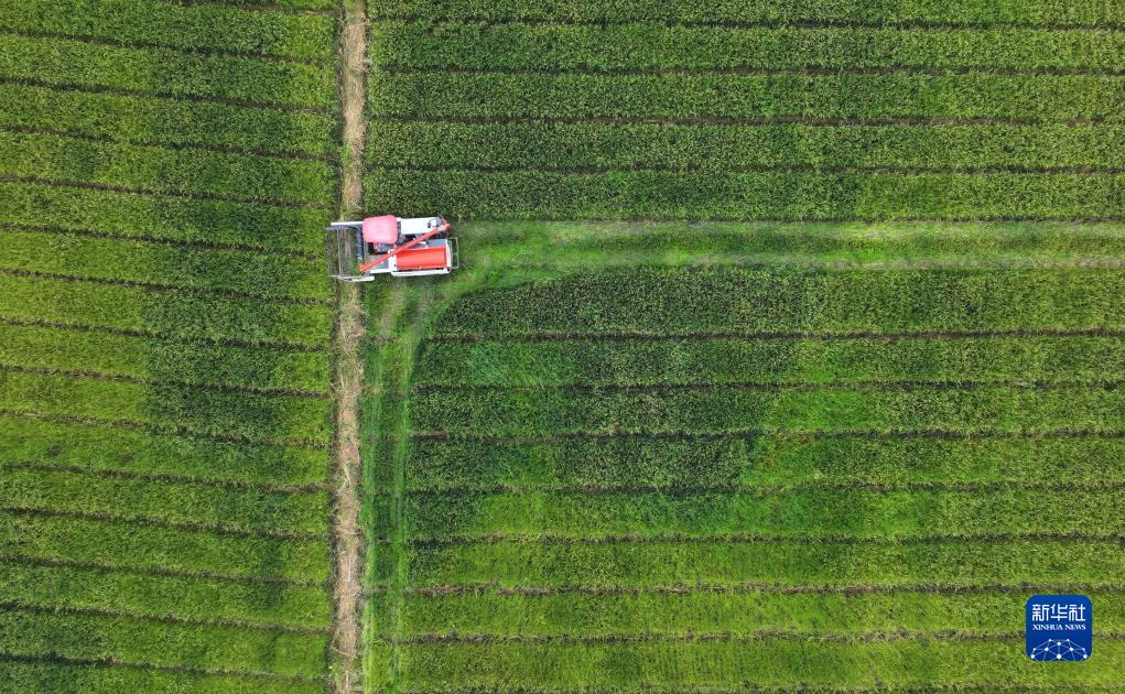 10月10日,農機手駕駛收割機在湖南省靖州苗族侗族自治縣甘棠鎮溪口村收割制種水稻(無(wú)人機照片)。
