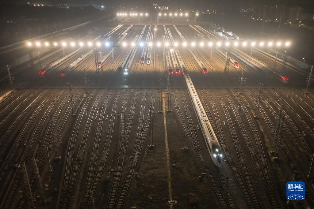 10月10日,動(dòng)車(chē)組列車(chē)從南京動(dòng)車(chē)段南京南動(dòng)車(chē)運用所駛出(無(wú)人機照片)。
