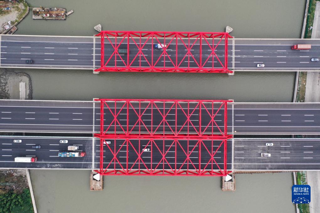 10月10日,車(chē)輛通過(guò)滬寧高速公路青陽(yáng)港大橋(無(wú)人機照片)。