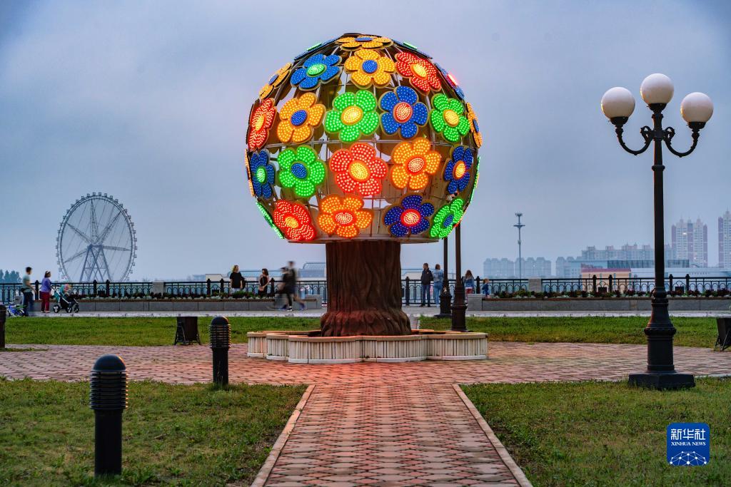 7月24日傍晚,俄羅斯布拉戈維申斯克市河堤上的景觀(guān)蘑菇燈被點(diǎn)亮。