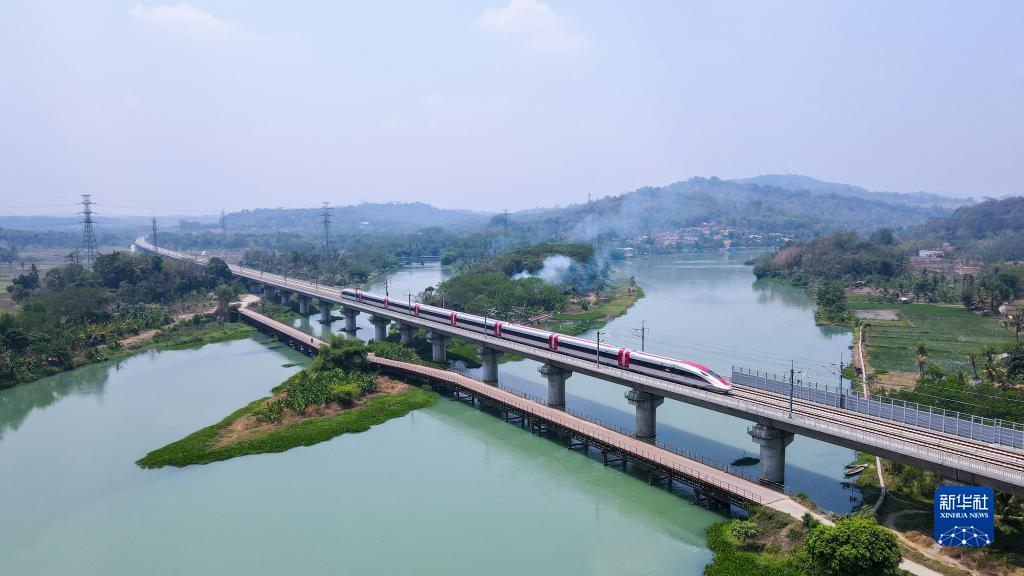 這是2023年9月30日在印度尼西亞普哇加達拍攝的一列行駛中的雅萬(wàn)高鐵高速動(dòng)車(chē)組(無(wú)人機照片)。雅萬(wàn)高鐵是印尼和東南亞第一條高速鐵路,是中印尼兩國高度關(guān)注的共建“一帶一路”旗艦項目,是國際上首個(gè)由政府主導搭臺、兩國企業(yè)合作建設和管理的高鐵項目。