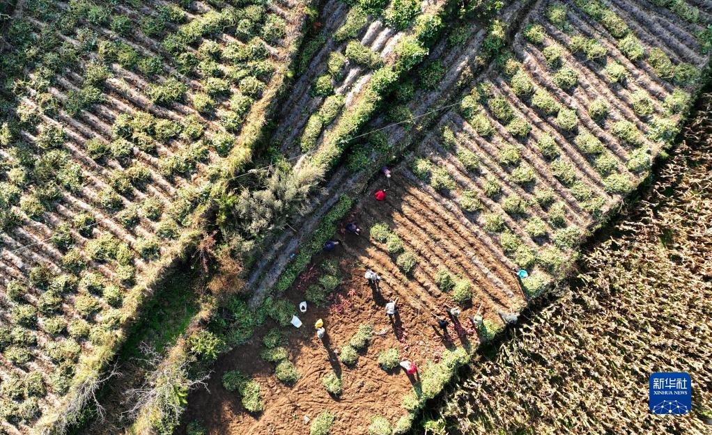 10月10日,農戶(hù)在河北省石家莊市平山縣孟家莊鎮上莊村收獲紅薯(無(wú)人機照片)。