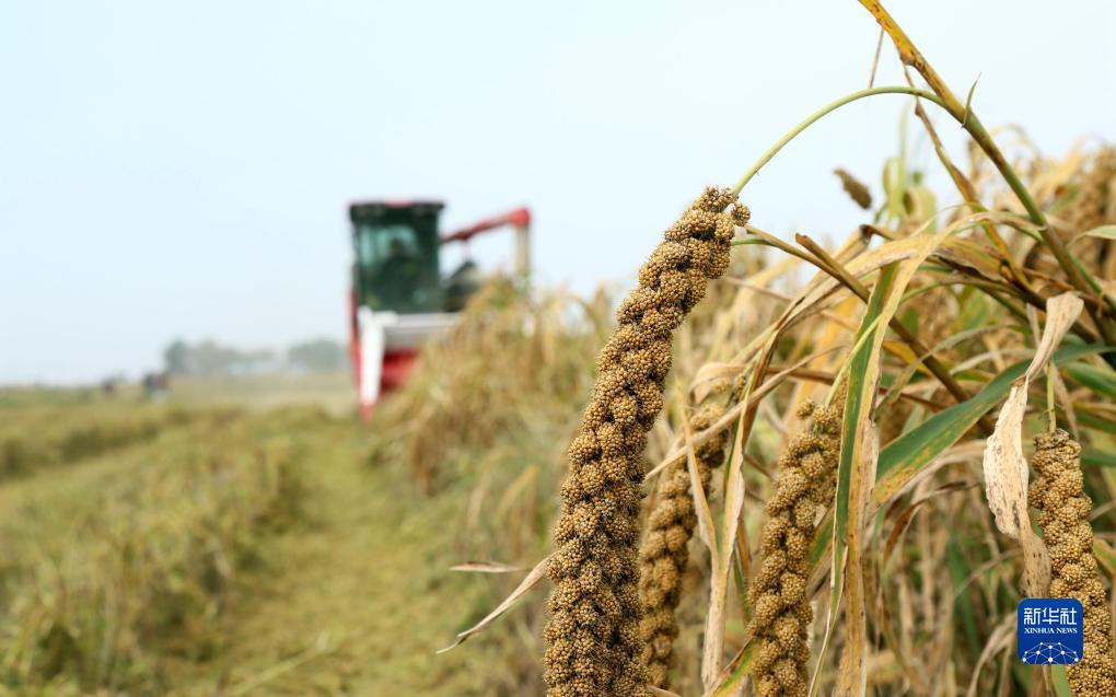10月10日,在河南省洛陽(yáng)市汝陽(yáng)縣蔡店鄉蟒莊村高標準農田谷子地,農民駕駛收割機在收獲谷子。