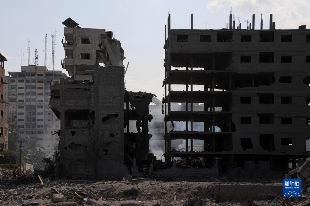 這是10月10日在加沙城拍攝的被以色列空襲炸毀的建筑廢墟。