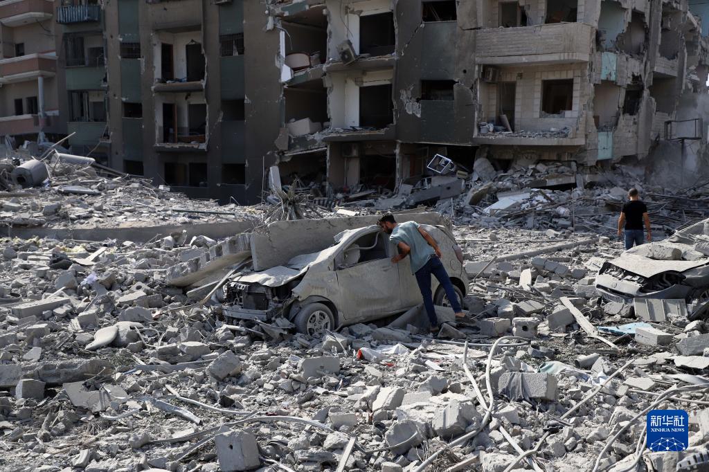 10月10日,在加沙城,一名男子查看被以色列空襲炸毀的車(chē)輛。