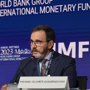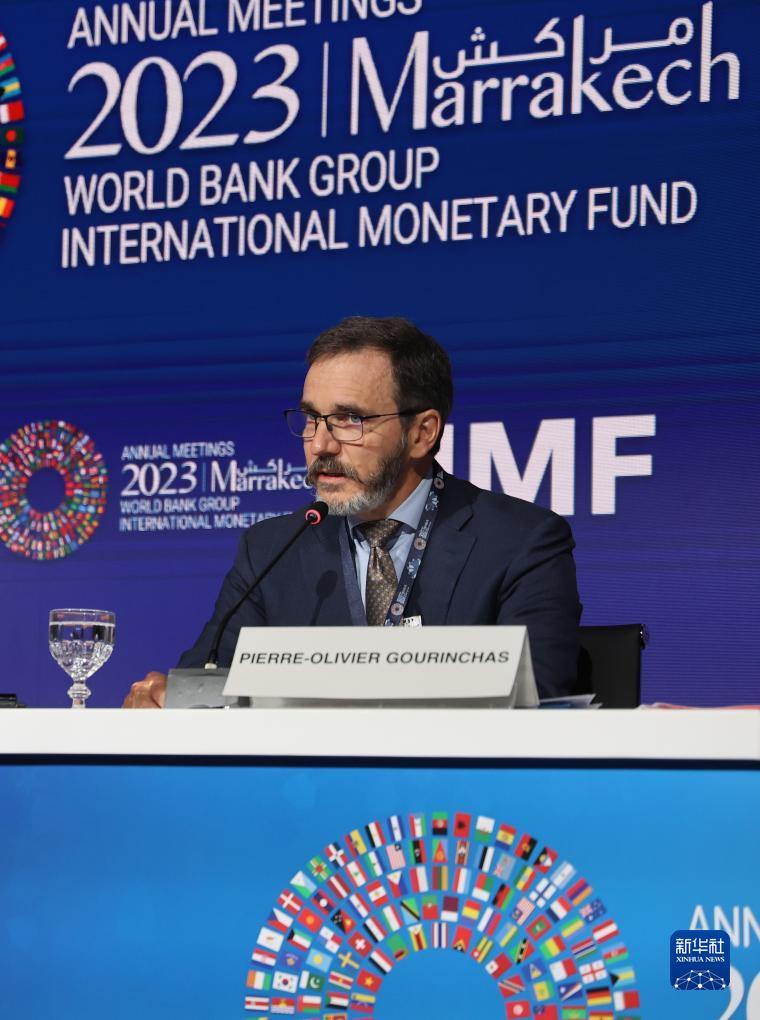 10月10日,在摩洛哥馬拉喀什,國際貨幣基金組織首席經(jīng)濟學(xué)家皮埃爾-奧利維耶·古蘭沙在《世界經(jīng)濟展望報告》發(fā)布會(huì )上講話(huà)。