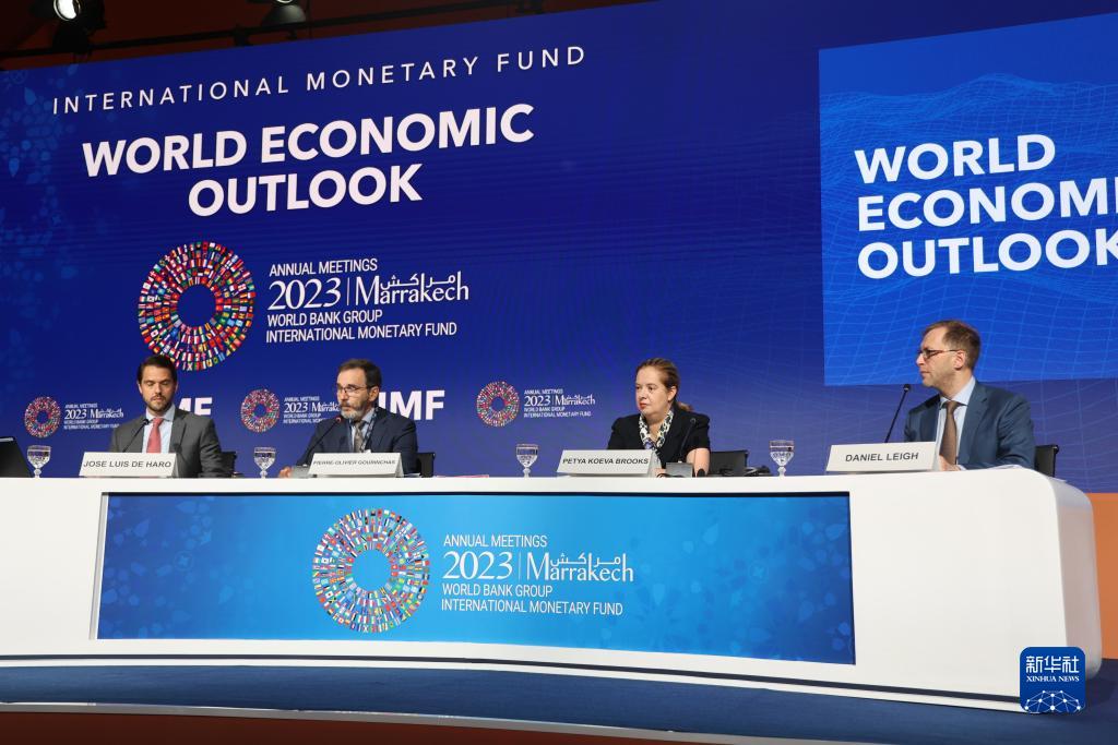 這是10月10日在摩洛哥馬拉喀什拍攝的《世界經(jīng)濟展望報告》發(fā)布會(huì )現場(chǎng)。