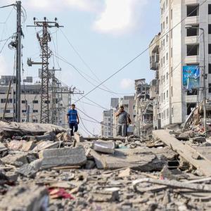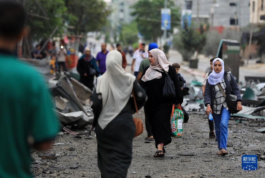 10月10日,在加沙地帶南部城市汗尤尼斯,人們在以色列空襲后走在街上。