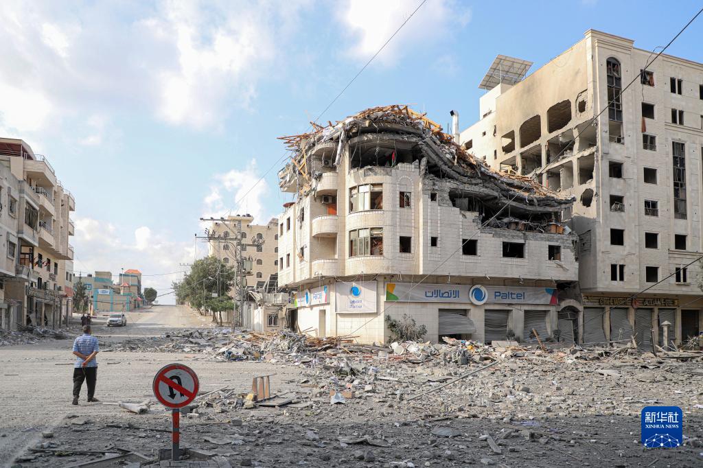 10月10日,在加沙城,人們走過(guò)被以色列空襲炸毀的建筑廢墟。