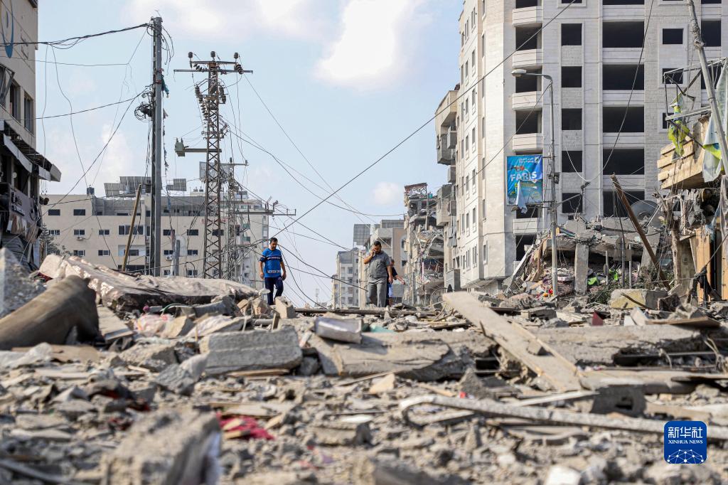 10月10日,在加沙城,人們走過(guò)被以色列空襲炸毀的建筑廢墟。