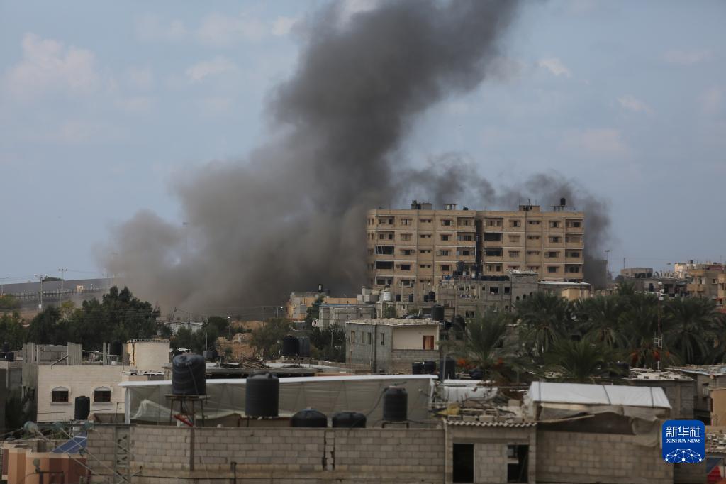 10月10日,加沙地帶與埃及接壤的拉法口岸遭以色列空襲后冒出滾滾濃煙。