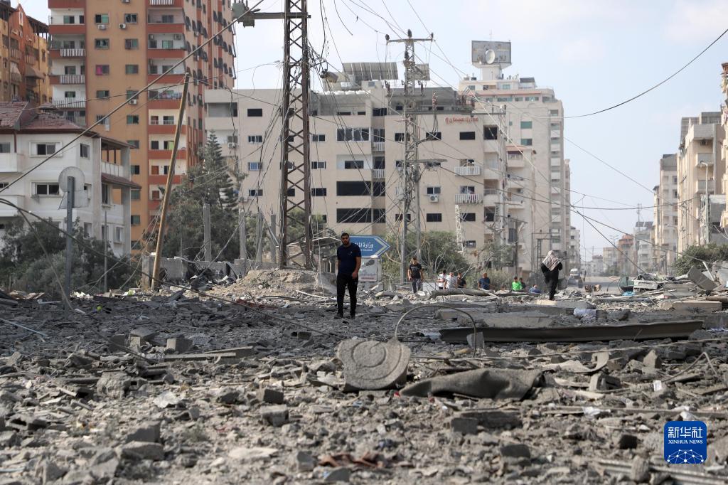 10月10日,在加沙城,人們走過(guò)被以色列空襲炸毀的建筑廢墟。
