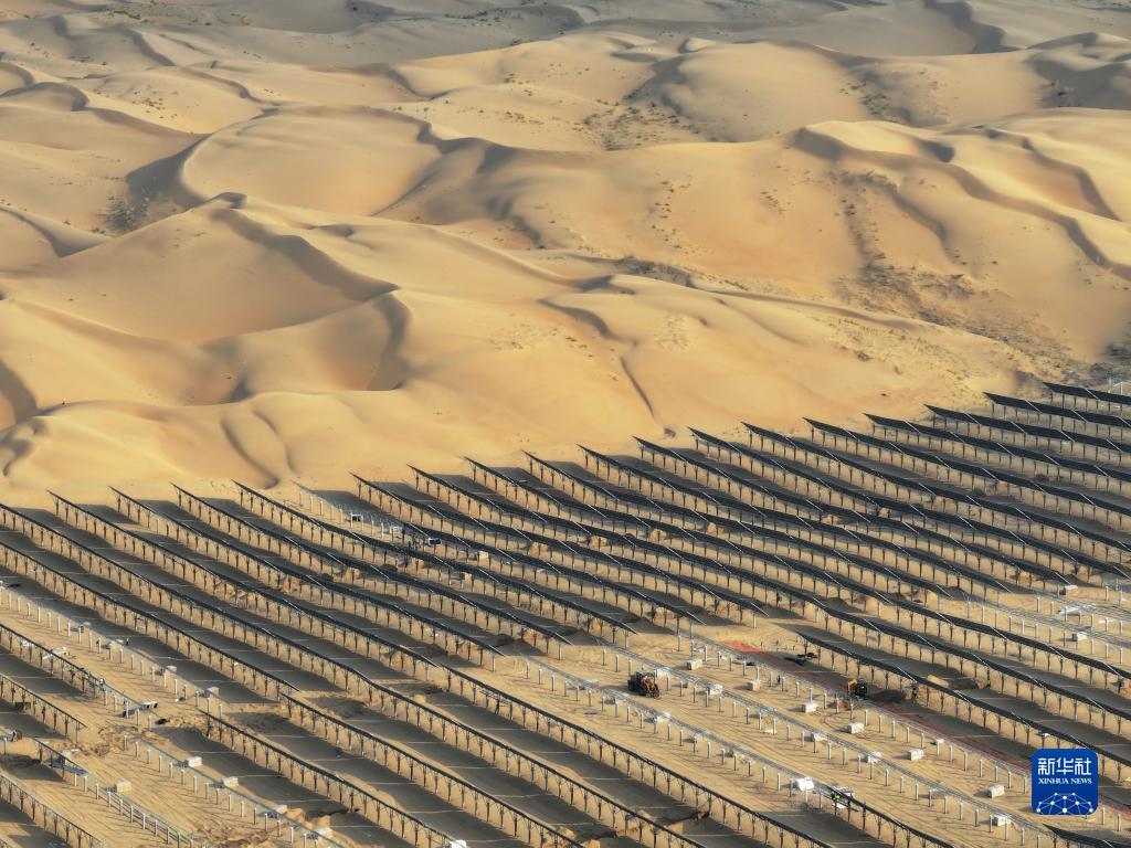 這是10月10日拍攝的建設中的庫布其沙漠鄂爾多斯中北部新能源基地(無(wú)人機照片)。