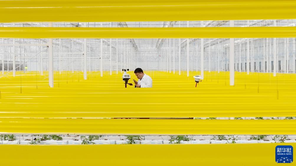 在浙江省湖州市德清縣阜溪街道龍勝村水木“未來(lái)農場(chǎng)”,技術(shù)人員觀(guān)察番茄智能大棚光照數據(2023年4月7日攝,無(wú)人機照片)。