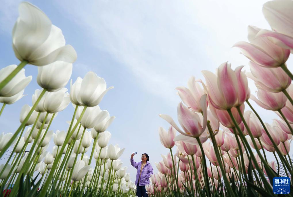 游客在河北省灤南縣東黃坨鎮閆莊戶(hù)村郁金香種植基地拍照(2023年5月3日攝)。