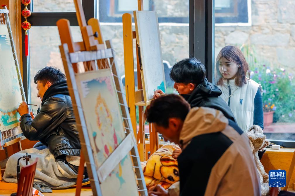 10月10日,在四川甘孜藏族自治州理塘縣,年輕藏族藝術(shù)家在“唐卡館”創(chuàng )作唐卡作品。