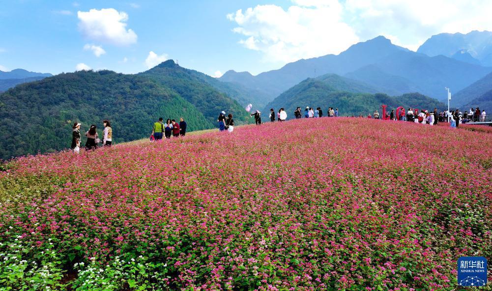 10月10日,游人在陜西省西安市藍田縣九間房鎮峪口村蕎麥嶺賞花游玩(無(wú)人機照片)。