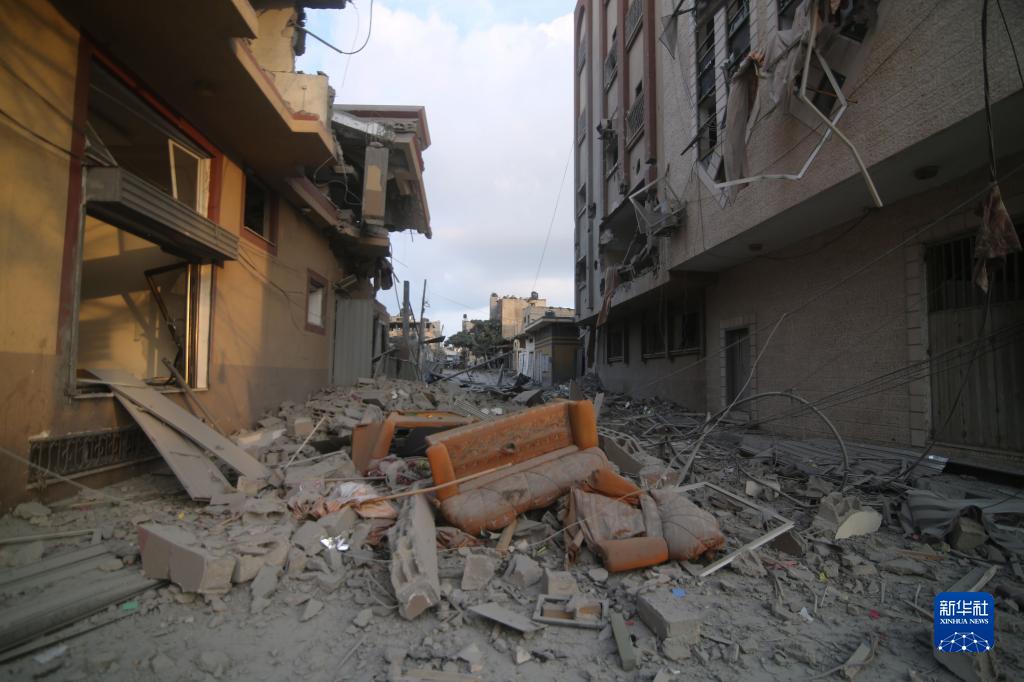 這是10月11日在加沙地帶南部城市拉法拍攝的被以色列空襲炸毀的建筑。