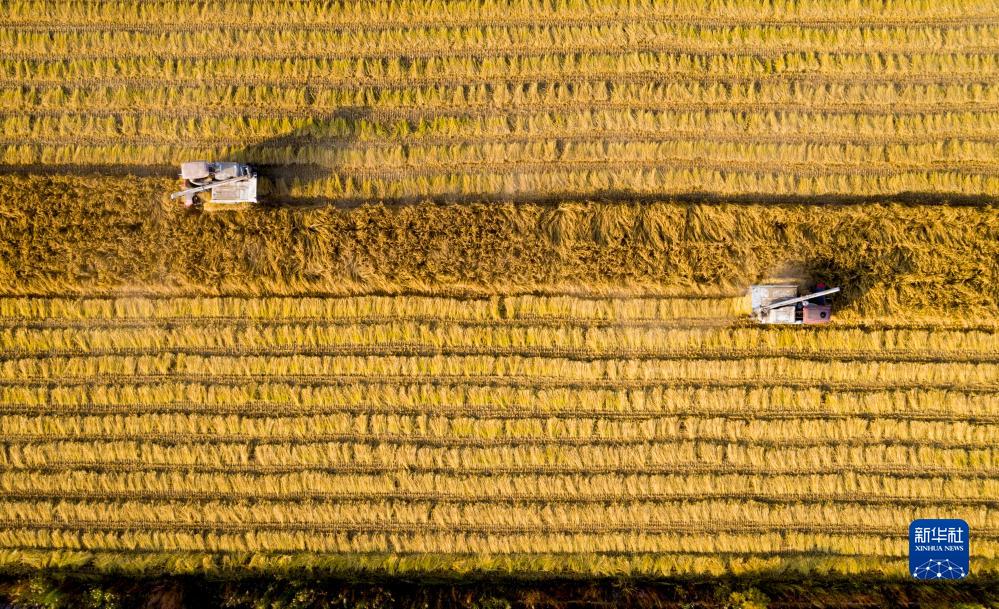 在寧夏銀川市賀蘭縣立崗鎮永華村,農民操作機械收割水稻(10月10日攝,無(wú)人機照片)。