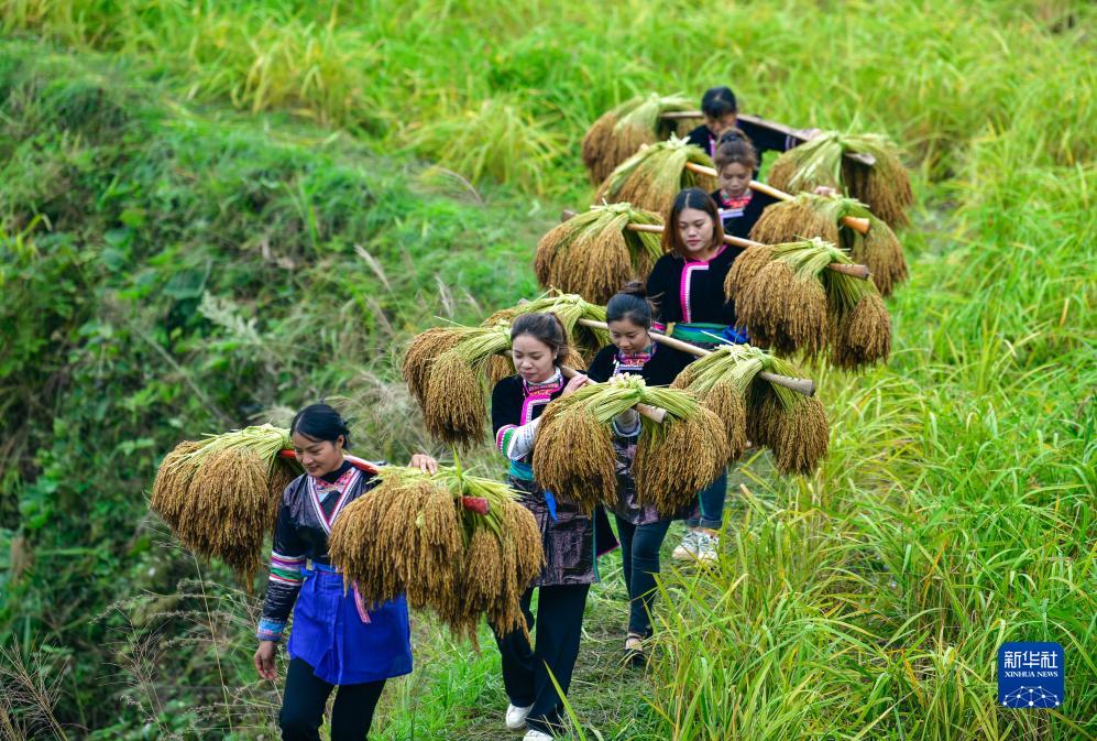 10月11日,村民在貴州省從江縣高增鄉建華村挑運香禾糯稻谷。