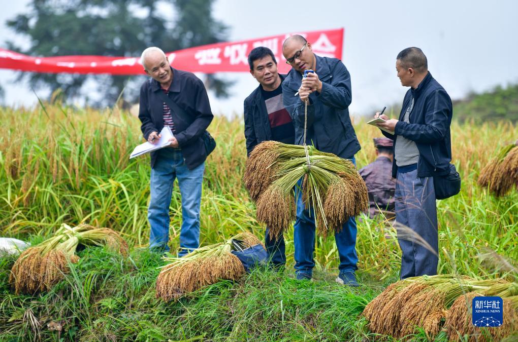 10月11日,農技人員在貴州省從江縣高增鄉建華村現場(chǎng)測產(chǎn)香禾糯稻谷。