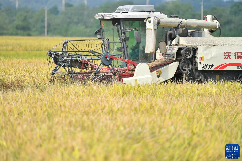 10月11日,在湖南省長(cháng)沙市望城區烏山街道維梓村,農戶(hù)駕駛收割機在農田里收割水稻。