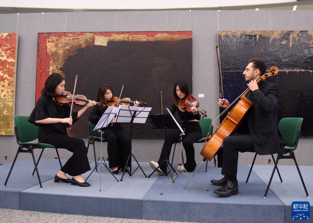10月6日,在奧地利維也納,中國留學(xué)生黃韻瑜(左一)和黃韻文(左二)在第三屆中歐國際藝術(shù)雙年展開(kāi)幕式上演奏。