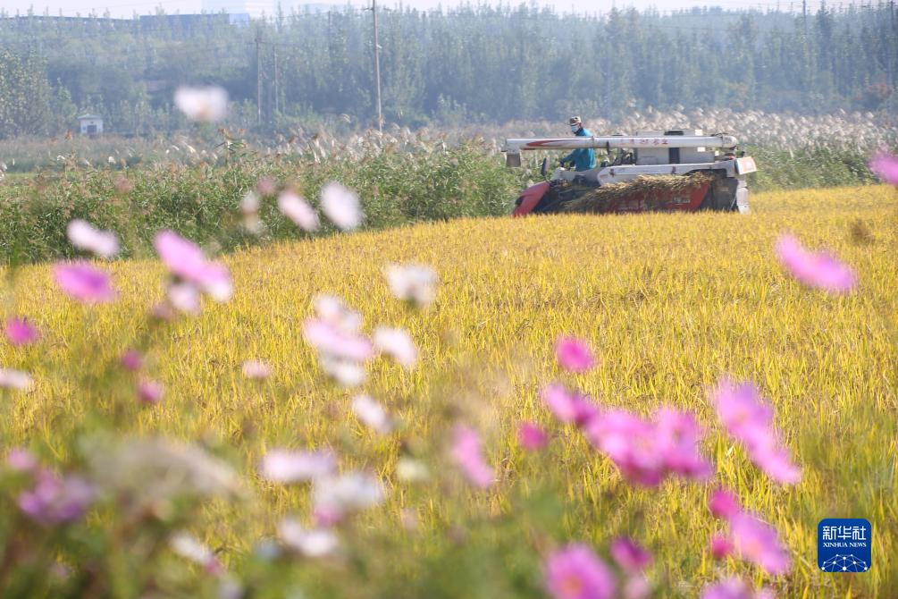 10月11日,村民駕駛收割機在山東省濟南市槐蔭區吳家堡街道七里鋪村收割水稻。