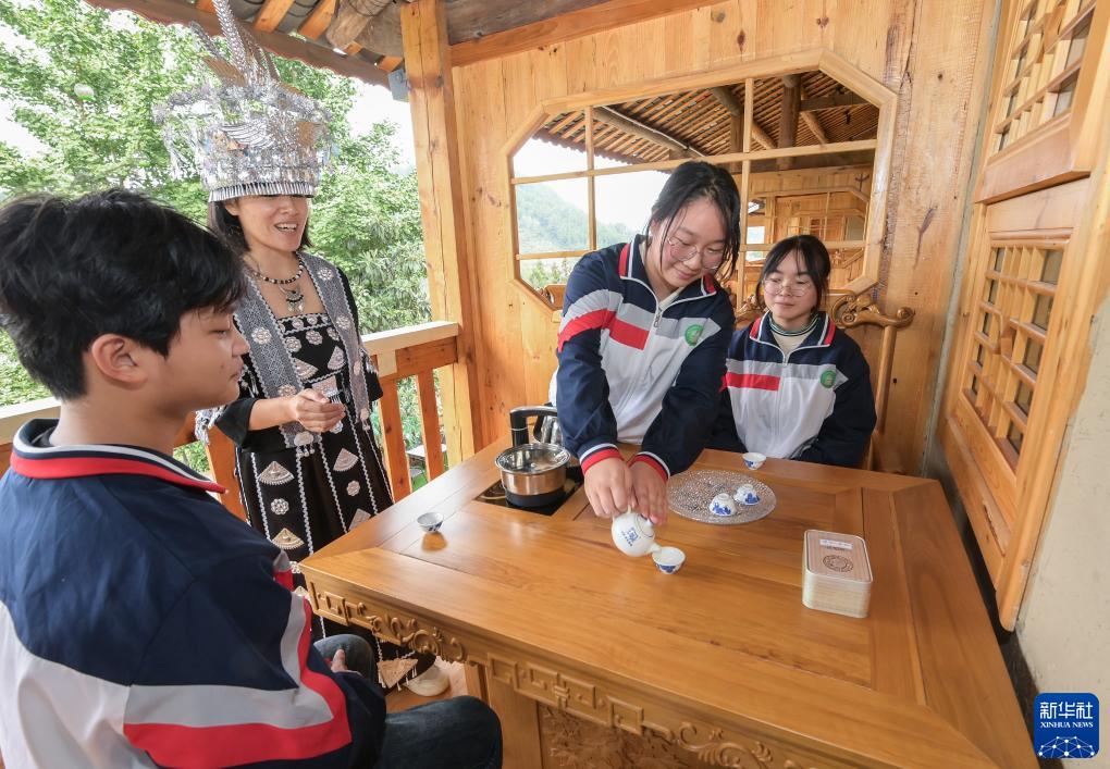 10月10日,重慶梁平職教中心的學(xué)生們來(lái)到橋頭鎮的陶然居瓦屋小寨,在陶然半山民宿內學(xué)習茶藝技術(shù)。