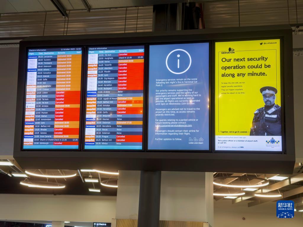 這是10月11日在英國倫敦盧頓機場(chǎng)航站樓拍攝的航班信息。