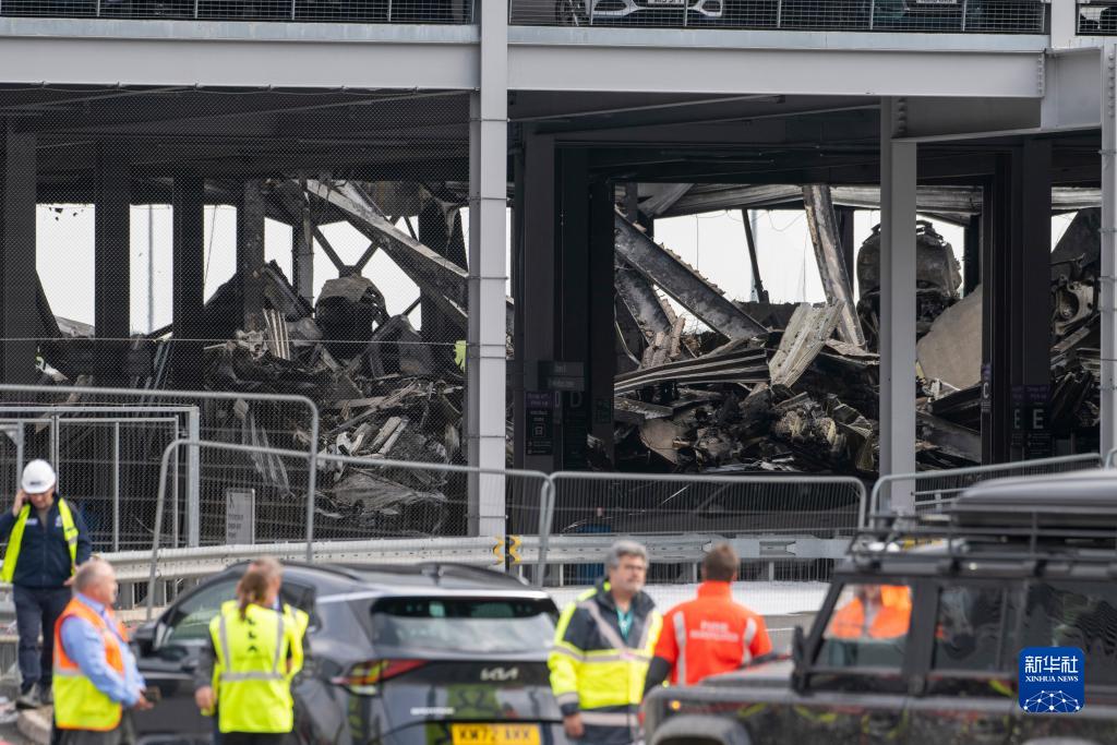 10月11日,在英國倫敦盧頓機場(chǎng),工作人員在失火停車(chē)場(chǎng)附近工作。