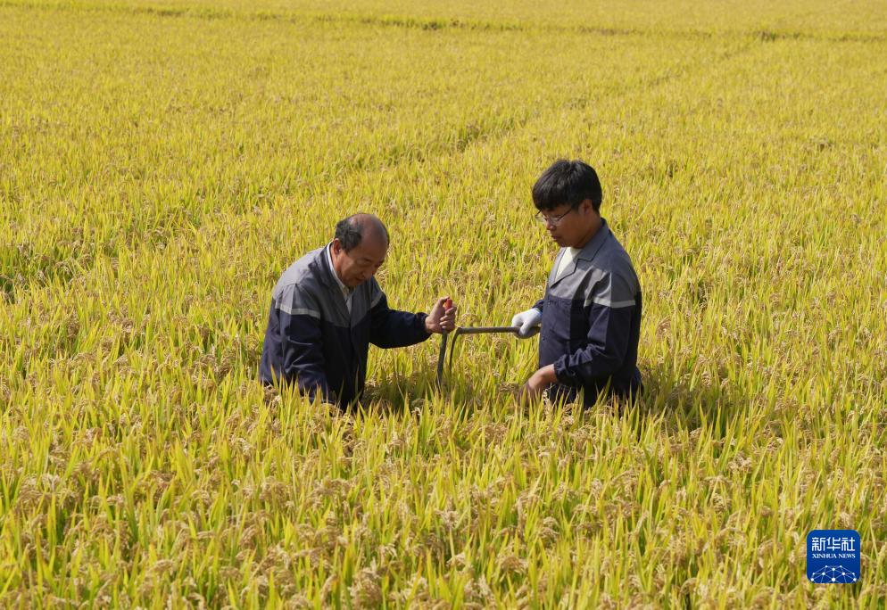 10月11日,在河北省唐山市曹妃甸區第五農場(chǎng)鹽堿地改良而成的高標準稻田,農業(yè)科研人員采集測產(chǎn)稻樣。