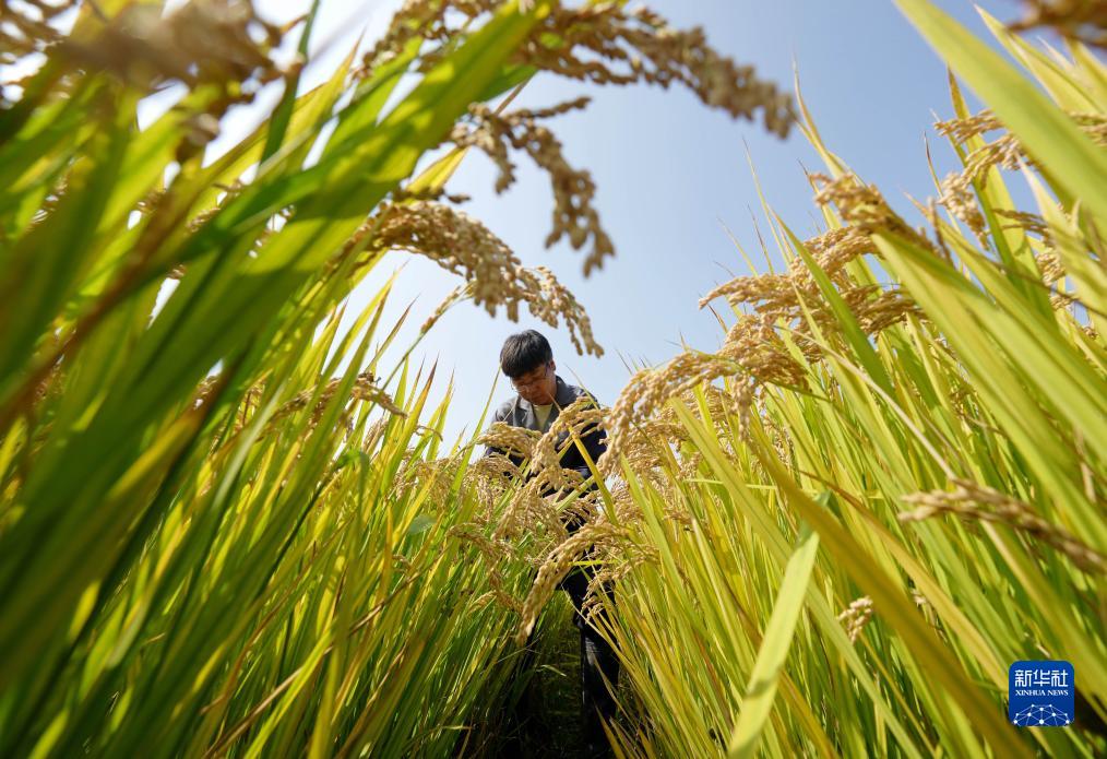 10月11日,農業(yè)科研人員在河北省唐山市曹妃甸區第五農場(chǎng)鹽堿地改良而成的高標準稻田內工作。