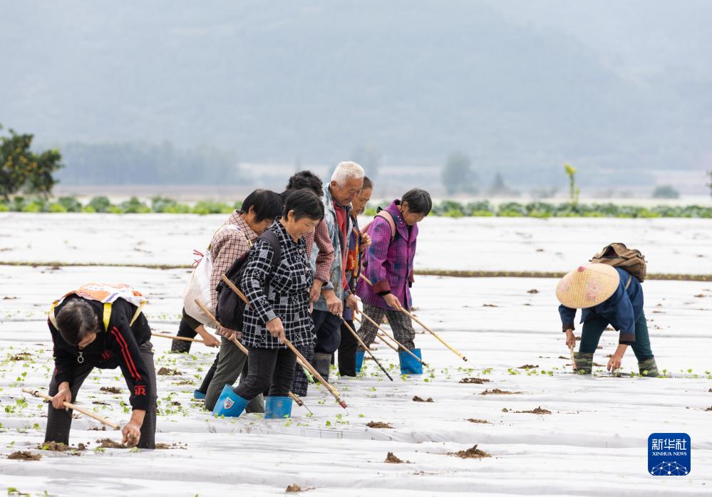 10月11日,在蓬安縣錦屏鎮中壩社區蔬菜種植基地,村民在田地里進(jìn)行蘿卜幼苗“破膜露苗”作業(yè)。