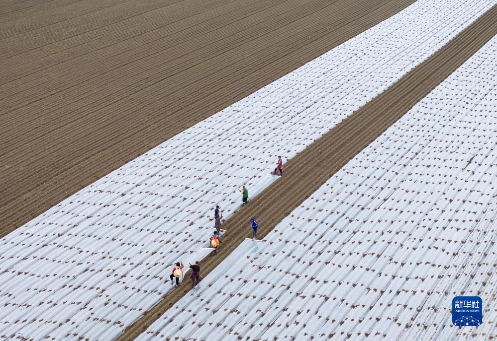 10月11日,在蓬安縣錦屏鎮中壩社區蔬菜種植基地,村民在田地里覆地膜(無(wú)人機照片)。