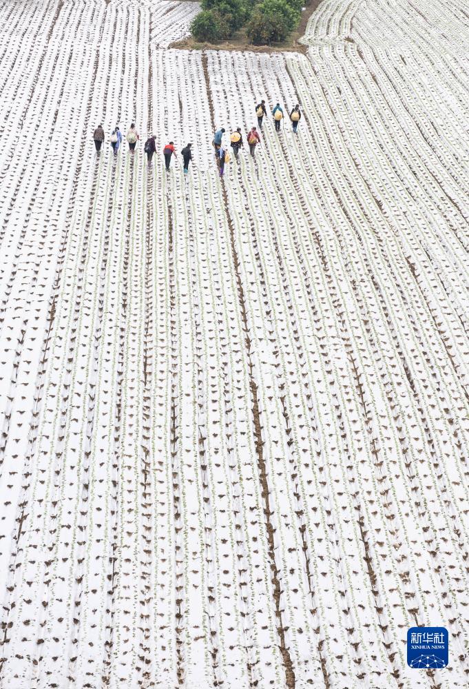 10月11日,在蓬安縣錦屏鎮中壩社區蔬菜種植基地,村民在田地里進(jìn)行蘿卜幼苗“破膜露苗”作業(yè)。